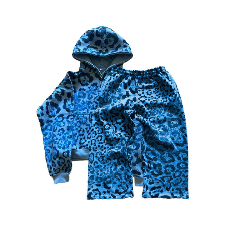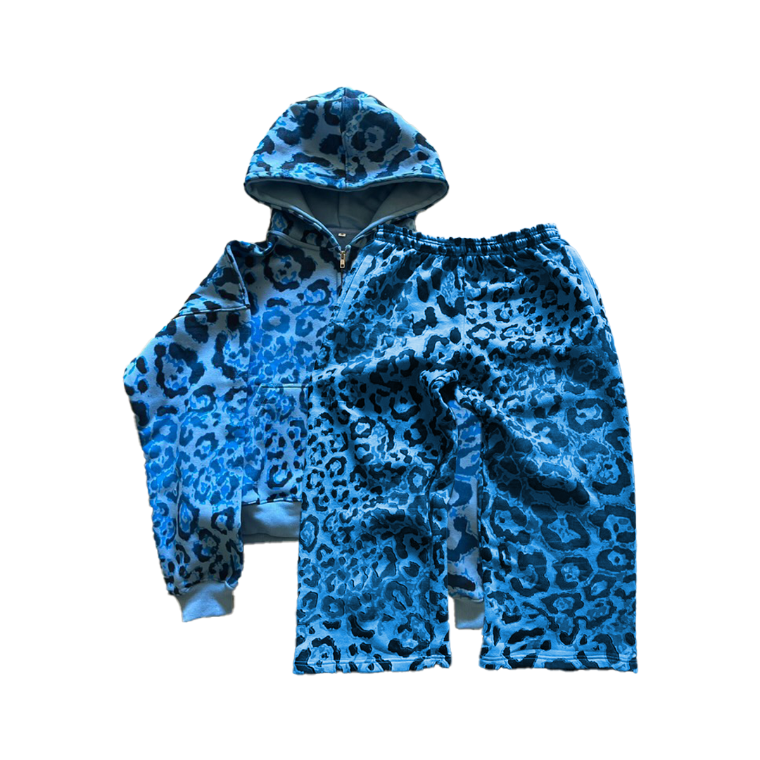 Heavyweight french terry cotton zip-up, with an all-over leopard print. Paired with a heavyweight french terry cotton pair of sweatpants, with concealed drawstrings. Wearable all-year round.