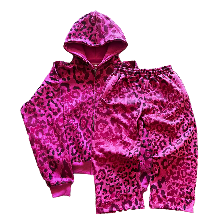 Heavyweight french terry cotton zip-up, with an all-over leopard print. Paired with a heavyweight french terry cotton pair of sweatpants, with concealed drawstrings. Wearable all-year round.
