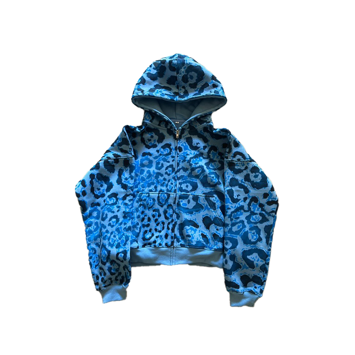 Heavyweight french terry cotton zip-up, with an all-over leopard print. Wearable all-year round.